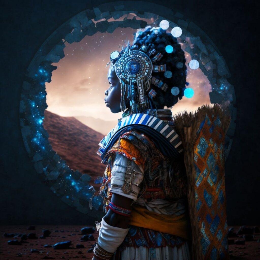 Bana Ba Dinaledi has produced a comprehensive digital art experience that reimagines African spirituality in a futuristic context. Set in 2043, the narrative envisions Sangomas as multi-planetary beings who consult with different entities under the stars, interpreting celestial intelligence to heal troubled souls—hence their characterization as “Children of the Stars.”